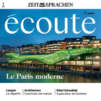 Liebe Hörerinnen und Hörer, in Ecoute Audio 2/21 machen wir uns auf die Suche nach den modernen Gebäuden von Paris, die die kontinuierliche Entwicklung der französischen Hauptstadt beweisen. In unserem Grammatikpunkt lernen Sie, wie man ... Nein sagt! Wir werden die Negation üben, die aus zwei Teilen zusammengesetzt ist. Dann begeben wir uns auf die Spuren von Eliott Schonfeld, einem jungen furchtlosen Abenteurer! Französisch lernen mit "Écoute Audio" Inhalt: mp3-Download inkl. 24-seitigem Booklet mit allen gesprochenen Texten zum Nachlesen und zweisprachigem Glossar (PDF-Format), Sprache: Französisch. Hören und Verstehen ist der beste Weg zum perfekten Französisch. Das französische Sprachtraining bietet Ihnen in ca. 60 Minuten interessante Beiträge, Interviews und Hintergrundberichte aus der französischsprachigen Welt. Die Texte werden von Muttersprachlern vorgetragen. Neben O-Ton-Interviews und Kultur-Tipps enthält jeder Audio-Download eine umfangreiche journalistische Reportage und einen sprachlichen Schwerpunkt zu französischer Grammatik und französischem Wortschatz.