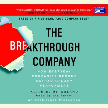 The vast majority of small businesses stay small—and not by choice. Only the most savvy and persistent—a tiny one tenth of one percent—break through to annual sales above $250 million. In The Breakthrough Company, Keith McFarland pinpoints how everyday companies become extraordinary, showing that luck is a negligible factor. Rather, breakthrough success turns out to be associated with a clearly identifiable set of strategies and skills that anyone in any business can emulate—from small startup to industry leader. Encouraged by experts such as business legend Peter Drucker and Good to Great author Jim Collins to identify the drivers that enable a company to push past the entrepreneurial phase, McFarland spent five years building and analyzing the world’s largest growth-company performance database and interviewing more than 1,500 growth-company executives on four continents. His goal was simple: to identify the secrets of breakthrough. The Breakthrough Company is the result. Winnowing a study pool of more than 7,000 companies down to nine that have made the transition to major-player status, McFarland highlights real-world tools and myth-busting insights that can be used by anyone wanting his or her business to join this exclusive circle. Among the book’s takeaways: • Common wisdom holds that the founders and core entrepreneurial leaders of a company must step aside for the business to reach the next level. Not true—as long as founders “crown the company” instead of themselves. • It’s not reckless to make ever-escalating bets on your company’s future, even going nose to nose with competitors many times your size. In fact, it turns out that the only safety comes in constantly upping the ante in exactly this way. • A Business Bermuda Triangle does exist, gobbling up companies on the verge of breakthrough. Presented here are three ways to navigate this potentially deadly hazard successfully. • However good you are—or think you are—you can’t do it alone. Learn how to surround your company with networks of outside resources, aka “scaffolding,” and how to enlist the aid of “insultants”—people who are willing to question a firm’s existing assumptions and ways of doing business. With powerful and specific action steps concluding each chapter—and invaluable advice on virtually every page from business leaders who’ve taken their companies to extraordinary levels of growth and profitability—The Breakthrough Company is one of the most provocative, inspiring, and instructive business books you’ll ever read.