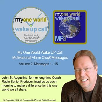 Awaken to inspiring messages about our precious planet from longtime Oprah Radio Sr. Producer, John St. Augustine. My One World Wake UP Call® is part of a series of patented inspiring, motivating messages invented by former longtime Broadway star, Robin Boudreau Palmer. My Wake UP Call® Motivational Alarm Clock® Messages & My Good Night Messages™ are uniquely structured, morning and evening 5-minute messages with renowned experts and thought leaders, who bookend every day with inspiration to achieve your personal goals and dreams, instead of with blaring buzzers and negative news. And now you can get inspired anytime, anywhere with My Wake UP Call® Motivating Messages and My Wake UP Call® Daily Inspirations!