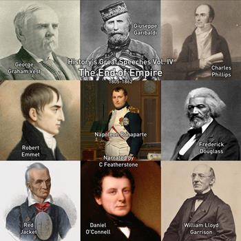 No discussion of the 19th Century is complete without Napoleon. We begin with Charles Phillips’ eulogy, summarizing the strangeness and contradiction of the most influential man of his time. Followed by 7 brief speeches by Napoleon himself. Two speeches chronicle the injustice and tyranny of British rule. Robert Emmet’s Speech From The Dock in 1803 is a classic of Irish Republicanism, given after sentence of death has been pronounced upon him for treason against the British. It is a speech intended for history, and sums up the fires that kept his homeland fighting for another century for their liberation. O’Connell’s Justice For Ireland, given 33 years later, shows that the passion that drove Emmett remained in the Irish heart, given in a more measured and technical tone, but driven by the same certainty that only with freedom could justice be found for the Irish people. Red Jacket’s speech contrasts the belief system of the Native Americans with that of the Christian invasion from Europe. It is paired with a speech about the hypocrisy of government and the selective application of the rule of law, Douglass’ speech given about slavery on the 4th of July (America’s independence day). Following is Douglass’ most renowned speech, “If there is no struggle, there is no progress.” This powerful statement of self-determination continues to resonate today. Garrison’s speech on the death of John Brown is given after the Harper’s Ferry incident, which was the first event ever communicated by telegraph, and rang the starting bell for the American civil war. Next is a rousing speech from Italy by Garibaldi, calling mankind to arms in a new era of revolution and social change. Lastly a humorous speech from George Vest in tribute to dogs. After all, however dark the world seems, however much revolution and madness taint the air…we will always be blessed by the love and loyalty of our four-footed friends.