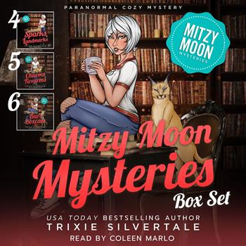 Find out why readers are so addicted to this series… Mitzy Moon is a psychic sleuth with a knack for stumbling onto corpses! Coming up empty on love and leads pushes Mitzy to unnecessary risks. Now her otherworldly helpers, a nosy Ghost-ma and a fiendish feline, are the only ones who can save her bacon. But with break-ins, Bingo, and big storms stalling out her investigation, she may not be able to keep her dad out of jail. Over 800 pages of sleuthing fun! The Mitzy Moon Mysteries: Books 4-6 includes three full-length novels from the hilarious paranormal cozy mystery series, PLUS a never-before-released recipe for Rhubarb Buckle. If you like snarky heroines, supernatural misfits, and a dash of romance, then you'll love Trixie Silvertale’s twisty whodunits. Buy this Mitzy Moon Mysteries Box Set to load a mystery in the chamber today! What Amazon readers are saying: ????? 'I can't stop reading these Mitzy Moon mysteries!’ ????? 'Charming must-solve paranormal cozy.’ ????? 'A ghost grandma, a real wild cat, and a girl named after a cheese… What's not to love?’ ????? 'Extremely well-written paranormal cozy!’ ????? 'This series just keeps getting better!’ Book 4 – Sparks and Landmarks: Paranormal Cozy Mystery A suspicious fire. A Valentine’s Day discovery. Will this psychic sleuth gamble—and lose? Book 5 – Charms and Firearms: Paranormal Cozy Mystery A weekend getaway. A charming present. Will this psychic sleuth find a suitor on the slopes? Book 6 – Bars and Boxcars: Paranormal Cozy Mystery A robbery on the rails. A gang in hiding. Can this psychic sleuth blow the whistle on a dangerous crew?