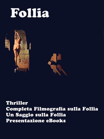 In questo eBook si prende in esame il tema della follia e si riporta anche un’ampia filmografia su questo tema. Inoltre viene presentato il Thriller Follia di Arnoldo Golvorthi. I temi trattati nell’eBook sono: Follia, Antefatto, 1 – La stanza delle torture, La Follia, Eziologia, I sistemi di disadattamento, L'interpretazione psicoanalitica, La follia nella storia, La follia nella cultura, Storia della follia nell'età classica, Idee principali, Una reclusione al posto di un'altra, L'internamento dei folli, eretici, criminali e libertini, Malattia dell'anima, Citazioni di Michel Foucault, Le parole e le cose, Storia della follia nell'età classica – Incipit, Film sulla Follia, La Letteratura Poliziesca, Classici del Giallo, Freising - Il Segreto di Hitler di Adelaide Byrne, Incipit, 1 - La ragazza scomparsa, La Maledizione del Manoscritto di Voynich di Adelaide Byrne, Incipit, 1 – Al Teatro Argentina, Il Male di Anna Caterina Grees, Incipit, 1 - La scoperta del cadavere, La Pergamena del Conte Ugolino di Anna Caterina Grees, Incipit, 1 – Khair ed-Din, 2 – Un incarico da spia, La Morte aleggia a Castel Glicine di Fiorenza Varden, Incipit, 1 – Soltanto una voce, L'Ombra della Follia di Guglielmo Lanyon Dave, Incipit, 1 – Sbarco in Germania, Il Tenebroso Bosco dei Misteri di Gustavo Giorgio Arnoldi, Incipit, 1 – La nascita della Stirpe del Lupo, 2 – Il Libro delle Ombre, Il Rubino di Mata Hari di Owen J. David, Antefatto, 1 – La Crisi Finanziaria, Il Mistero del Teatro della Morte di Paolo Trenti, Incipit, Antefatto, 1 – Nuda in scena, Intrigo a Londra di Tommaso Galloni, Incipit, 1 – Il compleanno, Negli oscuri meandri del castello, I Gialli Medioevali degli Uomini senza Volto, I Gialli Pulp Magazine: Presentazione Serie, I Gialli Pulp Magazine, La Dama Rossa uccide tre volte di Hank Monk, Incipit, Il mendicante e la meretrice, Il Diabolico Professor Mefisto, John Sherlock Holmes, il figlio di Sherlock Holmes, Segreto Mortale di Curt Matul, Incipit, 1 - Il Testamento della morte, Le Avventure di Kit Masterson, Le Avventure di Maschera Bianca, il Ladro Gentiluomo, Le Indagini Segrete di Gabriele D’Annunzio, Otto rintocchi di morte, Altre Indagini di Gabriele D’Annunzio, Sheila Holmes, la pronipote di Sherlock Holmes, Le Avventure di Sheila Holmes, pronipote di Sherlock Holmes.