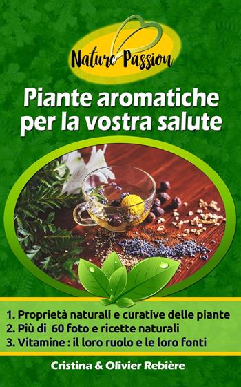 Piante aromatiche per la vostra salute Amate la natura, le piante e i fiori? Vi piacerebbe sapere come conoscerli meglio e poterli utilizzare per migliorare la vostra salute? Non vi piacerebbe saper cucinare in modo sano e preparare ogni sorta di piatto, preparazione o bevanda naturale per il vostro benessere ;-) La nostra collezione di guide pratiche "Nature Passion" lo dimostreranno! Scopri le guide facili ed economiche che vi aiuteranno a portare la natura nella vostra vita quotidiana! Desideriamo condividere con voi le nostre conoscenze utili e le nostre astuzie per "domare" facilmente questa Natura dalla quale la vita moderna ci ha allontanato. In questo ottavo numero studieremo le piante e faremo un breve salto nel Medioevo. In primo luogo vi descriverò le proprietà di alcune delle piante più comuni, con tanto di foto per poterle riconoscere in natura nel caso vogliate, come faccio io, raccoglierle direttamente ;-). Ci sono alcune erbe aromatiche che potete facilmente coltivare a casa vostra, in appartamento, sulla vostra terrazza o nel giardino se ne avete uno. Io stessa ne ho coltivate molte, sia all’interno che all’esterno. Questo vi permetterà di profittare non solo della loro freschezza e dei loro profumi inebrianti, ma queste erbe doneranno ancora più sapore ai vostri piatti, insalate o tisane. Cosa si trova in in questa guida? - Un breve "Ritorno" al Medioevo - Le vitamine, il loro ruolo nell’organismo e le loro fonti - Uso culinario e virtù medicinali delle piante + di 60 foto + di 20 ricette sane Allora, siete pronti per portare la natura nella vostra vita quotidiana? Cordiali saluti, Cristina & Olivier Rebiere