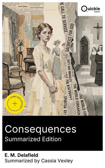 Consequences (1919) follows Alex Clare, a well-bred Edwardian girl whose refusal of an eligible proposal exposes the ruthless calculus allotted to women: marriage or marginality. Delafield tracks Alex from drawing rooms and debutante rites to the rigors of a convent, rendering the tug between piety, desire, and duty with unsparing psychological acuity. The prose blends cool social comedy with an increasingly austere clarity, interrogating the religious and domestic ideologies that shape a life. Situated between late Victorian social critique and interwar psychological fiction, the novel's study of female formation shades, inexorably, toward tragedy. E. M. Delafield (1890–1943), daughter of novelist Mrs. Henry de la Pasture, briefly entered a religious community in 1911 before leaving, and later served as a VAD in the Great War. That experience, coupled with intimate knowledge of upper-middle-class manners, gives the book its authority; satire and sympathy continually test each other. Readers of feminist social fiction, Edwardian cultural history, or the moral psychology of vocation will find Consequences both elegant and unsettling. It rewards close attention with sharp observation, ethical seriousness, and a haunting question about a self denied room to become. Quickie Classics summarizes timeless works with precision, preserving the author's voice and keeping the prose clear, fast, and readable—distilled, never diluted. Enriched Edition extras: Introduction · Synopsis · Historical Context · Brief Analysis · 4 Reflection Q&As · Editorial Footnotes.