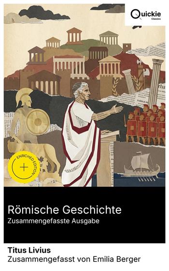 Römische Geschichte (Ab urbe condita) erzählt annalistisch Roms Weg von Aeneas und Romulus bis in die augusteische Gegenwart. Livius verbindet heroische Exempel, komponierte Reden und Prodigien mit sorgfältig gesammelten Quellen und entwirft ein moralisch-didaktisches Geschichtspanorama. Sein Stil vereint Pathos, klare Perioden und dramaturgische Motivführung; zugleich bevorzugt er exempla und mos maiorum vor strenger Quellenkritik. Im literarischen Kontext der frühen Kaiserzeit steht das Werk zwischen Mythos und Geschichte, im Dialog mit Polybios und den Annalisten, und spiegelt die Ideologie der moralischen Restauration. Titus Livius, aus Patavium stammend, war kein Amtsträger, sondern ein gelehrter Bürger mit Distanz zur Tagespolitik. Nähe zum Kreis des Augustus, zugleich der Ruf eines "Pompeianers", prägten seine Doppelperspektive: pietas gegenüber der alten res publica und Vertrauen in ordnende Macht. Er nutzte Annalisten, Inschriften und Volksüberlieferung und formte daraus eine Tugendgeschichte Roms. Rhetorische Schulung und die Krise der späten Republik motivierten ihn, Vergangenheit als Schule der Gegenwart zu schreiben. Empfohlen für Historiker, Philologen und politisch Interessierte: Wer Livius kritisch liest—besonders die legendengesättigten Frühbücher—gewinnt Quelle, Spiegel und Maßstab zugleich: für römische Identität, Staatsdenken und historische Erzählkunst. Quickie Classics fasst zeitlose Werke präzise zusammen, bewahrt die Stimme des Autors und hält die Prosa klar, schnell und gut lesbar – destilliert, niemals verwässert. Extras der erweiterten Ausgabe: Einführung · Zusammenfassung · Historischer Kontext · Autorenbiografie · Kurze Analyse · 4 Reflexionsfragen · Redaktionelle Fußnoten.