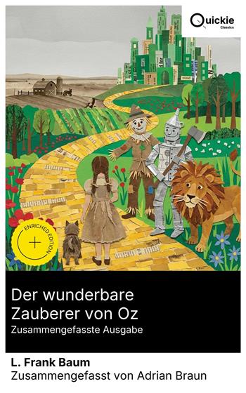 Der wunderbare Zauberer von Oz (1900) schildert Dorothys Wirbelsturm-Reise vom grauen Kansas ins farbintensive Oz, wo sie mit Vogelscheuche, Blechmann und Feigem Löwen auf dem Gelben Ziegelsteinweg den Zauberer aufsucht. Episodenhaft verknüpft Baum Prüfungen, Humor und klare Topografien; die schlichte, rhythmische Prosa dient einem dezidiert amerikanischen Märchenentwurf. Zentral sind Selbstwirksamkeit und die Demaskierung von Autorität, wenn der "Zauberer" als gewöhnlicher Mann erscheint. Im literarischen Kontext gilt der Text als Gegenentwurf zur viktorianischen Moraldidaxe und wurde teils populismusgeschichtlich allegorisch gelesen. L. Frank Baum (1856–1919) war Theatermann, Journalist und Unternehmer; sein Programm eines "modernen" Märchens ohne drakonische Strafen formulierte er explizit. Der Erfolg von Father Goose (1899) und Mother Goose in Prose ebnete den Weg; Bühnenerfahrung und visueller Sinn, befördert durch W. W. Denslows Illustrationen, strukturieren die szenische Bildkraft. Erfahrungen mit Mobilität und Scheitern an der Frontier speisen Motivik. Empfohlen für Leserinnen und Leser, die Kinderliteratur historisch denken: Dieses Werk vereint erzählerische Ökonomie, ikonische Bildwelten und subtiles Gesellschaftspanorama. Es eignet sich für Erstlektüre wie Seminarlektüre, eröffnet interdisziplinäre Diskussionen und bewahrt zugleich eine ungebrochene narrative Freude. Quickie Classics fasst zeitlose Werke präzise zusammen, bewahrt die Stimme des Autors und hält die Prosa klar, schnell und gut lesbar – destilliert, niemals verwässert. Extras der erweiterten Ausgabe: Einführung · Zusammenfassung · Historischer Kontext · Autorenbiografie · Kurze Analyse · 4 Reflexionsfragen · Redaktionelle Fußnoten.