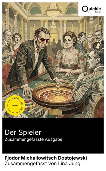 Der Spieler entfaltet in der fiktiven Kurstadt Roulettenburg die fiebrige Innenperspektive des Hauslehrers Alexej Iwanowitsch, dessen Leidenschaft für Polina Alexandrowna und für das Roulette unauflöslich verschränkt sind. In einer drängenden Ich-Erzählung, die zwischen satirischer Gesellschaftsskizze und psychologischem Realismus oszilliert, seziert der Roman die Grammatik des Zufalls: Begehren, Demütigung, Freiheit und Selbstzerstörung. Das Tempo ist stakkatohaft, die Szenen dicht montiert; der Komödienton (etwa mit der triumphal scheiternden Babuschka) verdeckt nie die tragische Ökonomie eines Milieus, das russische Statussehnsucht und westeuropäische Spielsucht ineinander spiegelt. Dostojewski schrieb den Text 1866 unter existentiellem und vertraglichem Druck: verschuldet, vom Verleger Stellowski zur Frist gezwungen, diktierte er das Werk in 26 Tagen der Stenographin Anna Snitkina, die er später heiratete. Eigene Erfahrungen in Wiesbaden und Baden-Baden, seine Nähe zu Spielsucht und zu Apollinarija Suslowa, sowie die nach der Verbannung geschärfte Sensibilität für Freiheit und Zwang prägen die klinische Genauigkeit der Darstellung. Empfehlenswert ist Der Spieler allen, die die Psychologie der Abhängigkeit, die Mechanik des modernen Risikos und die Satire einer transnationalen Kurgesellschaft studieren wollen. Als kompaktes Gegenstück zu Schuld und Sühne aus demselben Jahr bietet der Roman einen prägnanten Zugang zum Kern von Dostojewskis Projekt. Quickie Classics fasst zeitlose Werke präzise zusammen, bewahrt die Stimme des Autors und hält die Prosa klar, schnell und gut lesbar – destilliert, niemals verwässert. Extras der erweiterten Ausgabe: Einführung · Zusammenfassung · Historischer Kontext · Autorenbiografie · Kurze Analyse · 4 Reflexionsfragen · Redaktionelle Fußnoten.