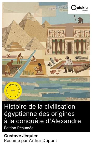 Dans cette synthèse, Jéquier retrace la civilisation égyptienne, des sociétés prédynastiques à l'arrivée d'Alexandre. Institutions, économie hydraulique, religion et funérailles, arts, techniques et vie quotidienne sont abordés en croisant monuments, objets et textes. D'un style méthodique, l'ouvrage suit une chronologie précise et s'ancre dans l'égyptologie du début du XXe siècle, privilégiant l'analyse matérielle pour penser continuités et ruptures. Égyptologue suisse, formé à la philologie et au terrain, Jéquier mena des fouilles majeures sur des nécropoles et complexes pyramidaux, publiant des rapports de référence. Son expérience de stratigraphe, conjuguée à la lecture des Textes des Pyramides, des Textes des Sarcophages et des témoignages grecs, nourrit cette histoire générale, où le politique, le religieux et l'économique sont mis en équilibre plutôt qu'en simple récit dynastique. On recommandera ce livre à quiconque cherche une vue d'ensemble fiable et claire. Certaines datations ont évolué, mais la solidité documentaire et la précision des analyses en font un guide sûr pour comprendre l'Égypte pharaonique jusqu'au seuil hellénistique, utile aux étudiants, curieux éclairés et professionnels du patrimoine. Quickie Classics résume avec précision des œuvres intemporelles, préserve la voix de l'auteur et maintient une prose claire, rapide et lisible – distillée, jamais diluée. Suppléments de l'édition enrichie : Introduction · Synopsis · Contexte historique · Brève analyse · 4 questions de réflexion · Notes de l'éditeur.