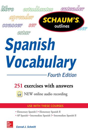 Tough Test Questions? Missed Lectures? Not Enough Time? Fortunately, there's Schaum's. This all-in-one-package includes more than 250 exercises with answers to sharpen your Spanish vocabulary skills. Plus, you will have access to 2 hours of downloadable audio files for additional practice--it' just like having your own virtual tutor! You'l find everything you need to build confidence, skills, and knowledge for the highest score possible. More than 40 million students have trusted Schaum's to help them succeed in the classroom and on exams. Schaum's is the key to faster learning and higher grades in every subject. Each Outline presents all the essential course information in an easy-to-follow, topic-by-topic format. Helpful tables and illustrations increase your understanding of the subject at hand. This Schaum's Outline gives you 251 practice exercises Easy-to-follow review of Spanish vocabulary Support for all the major textbooks for Spanish courses Free audio download for additional comprehension practice Fully compatible with your classroom text, Schaum's highlights all the important facts you need to know. Use Schaum’s to shorten your study time--and get your best test scores! Schaum's Outlines--Problem Solved.