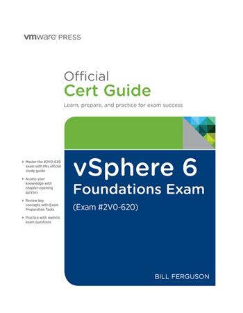 VMware 2V0-620 and 2V0-621 exams retired in 2019. We are continuing to make this content available for those who wish to use it to study the foundational information it contains. vSphere 6 Foundations Exam Official Cert Guide (Exam #2V0-620) vSphere 6 Foundations Exam Official Cert Guide (Exam #2V0-620) presents you with an organized test-preparation routine through the use of proven series elements and techniques. “Do I Know This Already?” quizzes open each chapter and enable you to decide how much time you need to spend on each section. Exam topic lists make referencing easy. Chapter-ending Exam Preparation Tasks help you drill on key concepts you must know thoroughly. · Master VMware vSphere 6 Foundations Exam topics · Assess your knowledge with chapter-opening quizzes · Review key concepts with exam-preparation tasks · Practice with realistic exam questions vSphere 6 Foundations Exam Official Cert Guide (Exam #2V0-620) focuses specifically on the objectives for the vSphere 6 Foundations (#2V0-620) Exam. Leading VMware consultant and trainer Bill Ferguson shares preparation hints and test-taking tips, helping you identify areas of weakness and improve both your conceptual knowledge and hands-on skills. Material is presented in a concise manner, focusing on increasing your understanding and retention of exam topics. The companion website contains a powerful Pearson IT Certification Practice Test engine that enables you to focus on individual topic areas or take a complete, timed exam. The assessment engine tracks your performance and provides feedback on a module-by-module basis, laying out a complete assessment of your knowledge to help you focus your study where it is needed most. Well regarded for its level of detail, assessment features, comprehensive design scenarios, and challenging review questions and exercises, this official study guide helps you master the concepts and techniques that will enable you to succeed on the exam the first time. vSphere 6 Foundations Exam Official Cert Guide (Exam #2V0-620) is part of a recommended learning path from VMware that includes simulation and hands-on training from authorized VMware instructors and self-study products from VMware Press. To find out more about instructor-led training, e-learning, and hands-on instruction offered worldwide, please visit www.vmware.com/training. The official study guide helps you master all the topics on the vSphere 6 Foundations Exam (#2V0-620), including · Identifying vSphere architecture and solutions for a given use case · Installing and configuring vCenter Server and ESXi · Configuring vSphere networking, including vSS, vDS, and their features · Configuring vSphere storage · Deploying and administering virtual machines, VM clones, templates, and vApps · Establishing and maintaining availability and resource management features, including clusters, fault tolerance, and resource pools · Troubleshooting ESXi, vCenter Server, vCenter operations, VM operations, and basic misconfigurations · Monitoring a vSphere implementation, including ESXi, vCenter Server, and virtual machines · Installing, configuring, and managing vCenter Operations Manager NOTE: Although there are changes between vSphere 6.0 and 6.5, they are not in the area of Foundations, therefore, vSphere 6 Foundations Exam #2V0-620 can be taken as part of official preparation steps toward your 6.5 or 7.0 certifications.