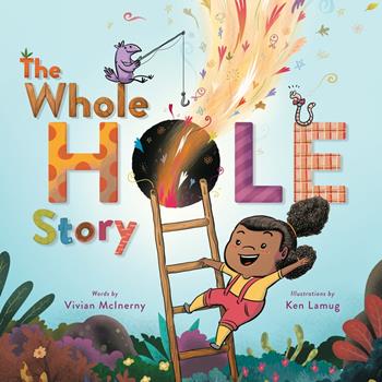 In Vivian McInerny’s playful debut, readers will fall in love with wonder again as Zia imagines what might happen if the hole in her pocket became big enough to fall right through. The Whole Hole Story is perfect for readers looking for a fresh take on the classic Harold and the Purple Crayon. Zia is used to the hole in her pocket—she frequently fills it with frogs and other objects. And as it gets bigger and bigger, she starts to wonder what might happen . . . if she fell right through. Would she cover it with a blanket to catch an elephant, or dig a tunnel to the other side of the world? The possibilities are endless, and readers will love following Zia’s adventurous imagination from beginning to end. With hilarious wordplay paired with Ken Lamug’s bright and colorful illustrations, The Whole Hole Story will appeal to kids’ divine sense of silliness. Perfect for fans of Du Iz Tak?, and They All Saw a Cat.