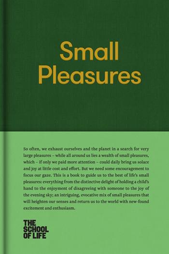 52 SMALL PLEASURES that bring us joy and solace. REAL-WORD TAKEAWAYS to help us thrive in everyday life. A FRESH PERSPECTIVE on seeing life with enthusiasm and energy. A SERIES OF SHORT, DIGESTIBLE MEDITATIONS, designed to open and read at any page. PART OF THE SCHOOL OF LIFE LIBRARY SERIES other titles include Calm, Relationships, and Great Thinkers.