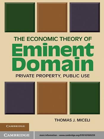 Surveys the contributions that economic theory has made to the often contentious debate over the government's use of its power of eminent domain, as prescribed by the Fifth Amendment. It addresses such questions as: when should the government be allowed to take private property without the owner's consent? Does it depend on how the land will be used? Also, what amount of compensation is the landowner entitled to receive (if any)? The recent case of Kelo v. New London (2005) revitalized the debate, but it was only the latest skirmish in the ongoing struggle between advocates of strong governmental powers to acquire private property in the public interest and private property rights advocates. Written for a general audience, the book advances a coherent theory that views eminent domain within the context of the government's proper role in an economic system whose primary objective is to achieve efficient land use.