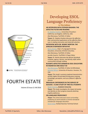 The Fall 32(3) Issue of the Fourth Estate is an incredible issue hosting two interviews with prominent ESOL theorist, Steven Krashen and Bonny Norton as well as a variety of other articles and authors on developing ESOL student language proficiency. This issue also includes several lesson plans and activitives to help novice and experienced teachers discover and breakout into new methods.