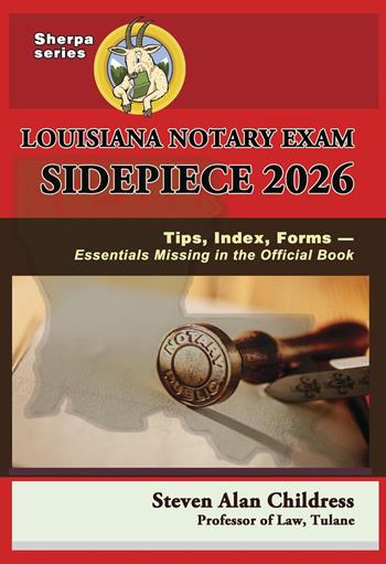NEW 2026 EDITION of the best-selling notary prep guide to the challenging Louisiana exam. The Louisiana Notary Exam averages a 20% pass rate. The Notary Exam has an official Study Guide you use during the exam. But the Study Guide has no index, no big picture, no study strategies, no exam-day tips, not enough cross-references . . . and few of the forms notaries use that they test. It's notoriously hard to follow. It doesn't explain most-tested subjects, past exams, or recent changes. It's got the law and notary rules, but it's missing essentials for any such textbook. The Sidepiece has all that and much more that anyone contemplating the exam should read. It even includes crucial information about notary practice for the newbie notary, and is useful to experienced notaries for its expanded cross-references, complete index, and summary lists. Basically it's the rest of the official Study Guide they somehow omitted. Why would they leave out the index, of all things? Reminder: a 20% pass rate. Previous editions of this resource earned hundreds of 5-star ratings and comments that it's "essential" and "invaluable" to passing the exam, whether or not you take a prep class too. Read the reviews to get the scope, coverage, and necessity of adding this book into your study program. "The author's tips on what to expect on test day were worth the cost of the book alone. Get. This. Book." Please see all the reviews of editions yearly since 2020. As a senior law teacher and member of two state bars, Prof. Childress still needed to pass the Louisiana Notary Exam to practice as one. It's a challenging exam for everyone, yet he found in the 'Study Guide' lots of trees but little forest--and even less real guidance. Determined that current test-takers can do better with more real help, he wrote this book and geared the page numbers including an index, cross-references, lists, and illustrated explanation of successions, community property, and authentic acts to the latest edition of the state's official text, Fundamentals of Louisiana Notarial Law and Practice. An affordable addition to the Sherpa Series from Quid Pro Books. ABOUT THE AUTHOR: Steven Alan Childress is a senior professor of law at Tulane University and co-teacher of the leading notary prep class for the challenging Louisiana exam.