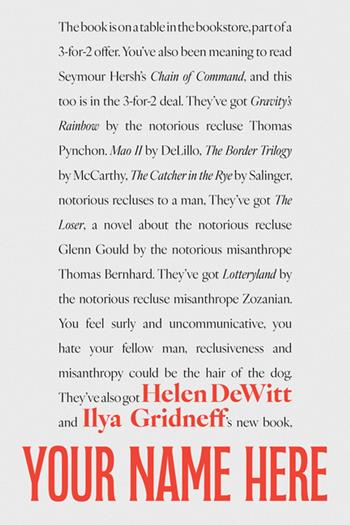 A major literary event over two decades in the making, Your Name Here marks the seismic return of Helen DeWitt (The Last Samurai), and will introduce readers to the riveting voice of Ilya Gridneff. A book of unparalleled scope and vision, Your Name Here is a spectacular honeycomb of books-within-books. In this death-defying feat of ambition, collaborators Helen DeWitt and Ilya Gridneff weave together America’s “War on Terror,” countless years of literary history, authorial sleight of hand, Scientology, dream analysis, multiple languages, emails, images, graphs, into something wondrous and unique. A metafictional Pygmalion story reminiscent of Charlie Kaufman‘s Oscar-nominated Adaptation, or Italo Calvino’s If on a winter’s night a traveler; Your Name Here is a rare work of art that captures the process of becoming itself. A reminder that a masterpiece and a doomed voyage look the same at the start.