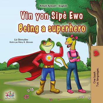 Haitian Creole English Bilingual children's book. Perfect for kids learning English or Haitian Creole as their second language. Many children dream of becoming superheroes. In this children's book, Ron and his best friend Maya go through a fun journey to become heroes. They learn important superhero rules which help them complete their first mission. They work together and help Maya's brother, learning new things about themselves. Do you want to become a superhero too? Anpil timoun reve pou yo tounen sipè ewo. Nan liv timoun sa a, Ron ak meyè zanmi li, Maya, fè yon bèl vwayaj amizan pou yo vin ewo. Yo aprann kèk règ enpòtan pou sipè ewo ki ede yo konplete premye misyon yo. Yo travay ansanm epi ede frè Maya a, pandan yap dekouvri nouvo bagay de tèt yo. Èske ou vle vin yon supè ewo tou?