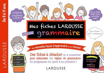 Voici une nouvelle façon d'apprendre et de revoir les notions clés du programme de l'école primaire : les fiches Larousse permettent aux élèves de mémoriser tout ce qu'il faut savoir en grammaire en un seul coup d'œil : accord du sujet et du verbe, accord des adjectifs qualificatifs, phrases interrogatives, impératives, négatives, phrase complexe, propositions principale et subordonnées, attribut du sujet, épithètes...