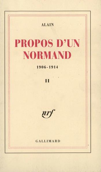 Émile Chartier (1868-1951), qui signait Alain, a publié à l'intention des lecteurs de divers journaux cinq mille "Propos", dans l'intention avouée de "relever l'entrefilet au niveau de la métaphysique". Éloigné de tout esprit de système, il a exposé dans un style d'une rare clarté sa vision de l'homme, être d'imagination et de passion, en charge d'âme, c'est-à-dire de lui-même. Les Propos d'un Normand rassemblent en cinq tomes les billets quotidiens qu'il donnait à La Dépêche de Rouen.