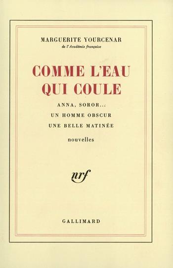Comme l'eau qui coule est un recueil de trois nouvelles, dont la première, Anna, soror..., se trouve republiée sans changement important et dont les deux autres ont été entièrement composées entre 1979 et 1981. En fait, ces trois œuvres ont occupé Marguerite Yourcenar pendant une grande partie de sa vie. Écrit en 1925, inclus en 1935 dans le recueil La mort conduit l'attelage, publié isolément en 1981, Anna, soror... a pour sujet l'inceste entre un frère et une sœur et se situe à Naples, au XVIe siècle. La vie et la mort de Nathanaël, dans la Hollande du XVIIe siècle, est le sujet d'Un homme obscur. Un homme simple, presque sans culture, 'levant sur le monde un regard d'autant plus clair qu'il est plus incapable d'orgueil'. Le héros d'Une belle matinée est Lazare, le fils de Nathanaël, un enfant mêlé à une troupe de comédiens shakespeariens. À travers les brochures du théâtre élisabéthain, le petite Lazare vit d'avance toute vie : tour à tour fille et garçon, jeune homme et vieillard, enfant assassiné et brute assassine, roi et mendiant, prince vêtu de noir et bouffon bariolé du prince.