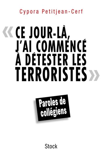J’enseigne les lettres depuis douze ans dans un collège du Val-de-Marne. C’est dans cette même banlieue, à ent mètres du collège, qu’Amedy Coulibaly abandonna sa voiture le 8 janvier 2015, entraînant le bouclage de tout le quartier et de notre établissement. Ce livre contient des paroles d’élèves au lendemain des attentats survenus à Charlie Hebdo et à l’Hyper Cacher, explore leurs réactions et tente de comprendre qui est cette jeunesse. La semaine du 26 janvier, je propose en effet à mes élèves de 4e et de 3e de revenir par écrit sur les événements des 7, 8 et 9 janvier. Je leur distribue des feuilles blanches sur lesquelles ils sont dispensés d’écrire leur nom afin de se sentir libres. Mon souhait : recueillir des opinions spontanées, une pensée qui ne soit ni encadrée, ni dirigée, ni teintée par celle de l’adulte. Au lendemain des événements, c’est là que réside à mon sens la vraie mixité : dans la disparité des réactions. Engagement versus nonchalance. Conscience collective versus individualisme. » C. P.-C.