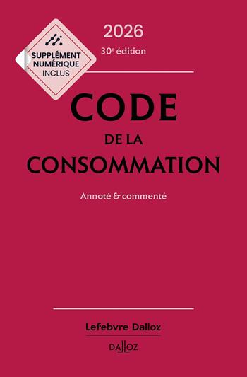 Réforme de l'action de groupe et du démarchage téléphonique Les + de l'édition 2026 : - commentaires à jour des toutes dernières réformes; - enrichissements abondants: commentaire, bibliographie et annotation de jurisprudence; - tables de concordance entre l'ancien et le nouveau code; - contenu numérique additionnel. - supplément en ligne inclus. Le Code de la consommation Dalloz rassemble l'ensemble des textes intéressant la matière. En plus des parties codifiées, il comprend un Appendice présentant de nombreuses rubriques en rapport avec la protection des consommateurs. L'édition 2026 est à jour, dans sa partie codifiée et ses textes complémentaires, des réformes les plus récentes, notamment : - loi du 30 juin 2025 contre toutes les fraudes aux aides publiques, qui réforme, notamment, le démarchage téléphonique; - loi du 30 avril 2025 portant diverses dispositions d'adaptation au droit de l'Union européenne en matière économique, financière, environnementale, énergétique, de transport, de santé et de circulation des personnes, qui réforme, notamment, l'action de groupe; - loi du 24 février 2025 visant à interdire les dispositifs électroniques de vapotage à usage unique; - décret du 13 février 2025 relatif à l'étiquetage des viandes bovines dans les établissements de restauration; - décret du 12 février 2025 relatif à la nouvelle procédure de saisie des rémunérations; - décret du 30 décembre 2024 relatif au mode de production biologique des produits agricoles et à leur étiquetage; - décret du 6 décembre 2024 portant mesures d'adaptation du code de la consommation à l'entrée en vigueur du règlement (UE) 2023/988 du 10 mai 2023 relatif à la sécurité des produits; - ordonnance du 6 novembre 2024 modifiant la loi n° 2023-451 du 9 juin 2023 visant à encadrer l'influence commerciale et à lutter contre les dérives des influenceurs sur les réseaux sociaux; - directive du 23 octobre 2024 relative à la responsabilité du fait des produits défectueux et abrogeant la directive 85/374/CEE; - décrets des 16 juillet 2024 relatifs à l'information des consommateurs et à l'utilisation de pièces issues de l'économie circulaire utilisées dans le cadre des prestations d'entretien ou de réparation des véhicules automobiles et des véhicules à deux ou trois roues motorisés.