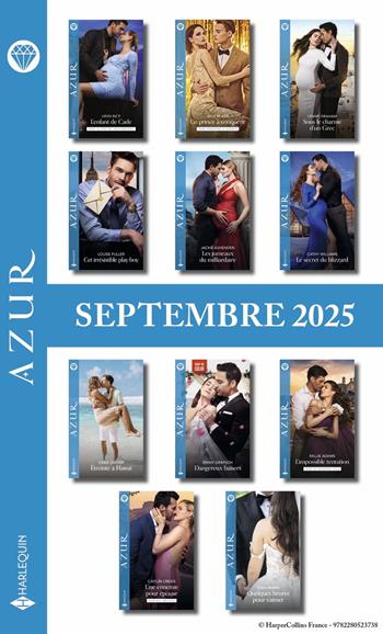 Intégrale 11 romans de la collection Azur + 1 gratuit : tous les livres de Septembre (N°4906 à 4916) en un seul clic ! Sous le charme d’un Grec, Lynne Graham Une ennemie pour épouse, Caitlin Crews Cet irrésistible play-boy, Louise Fuller Les jumeaux du milliardaire, Jackie Ashenden Le secret du blizzard, Cathy Williams Étreinte à Hawaï, Cara Colter Dangereux baisers, Emmy Grayson L’enfant de Cade, Heidi Rice Un prince à conquérir, Ally Blake L’impossible tentation, Millie Adams Éprise de son meilleur ami, Michelle Douglas – réédité BONUS ! 1 roman GRATUIT inclus : Quelques heures pour s’aimer, Tara Pammi – réédité