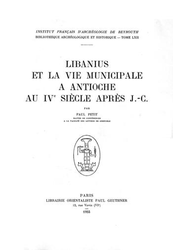 Célèbre rhéteur de culture grecque, Libanius (314–393) est l'auteur d'une œuvre immense, qui fit l'admiration de ses contemporains et qui servit de modèle pendant toute l'histoire de Byzance. Son œuvre est l’une des plus importantes que l’Antiquité nous ait transmise. Elle se compose d’une soixantaine de discours sur des thèmes tel que l’art oratoire, la justice ou les problèmes relatifs à la vie des écoles et des grandes cités, 51 déclamations portant essentiellement sur des sujets historiques et mythologiques, et plus de 1500 lettres adressées aux empereurs, aux préfets, ainqi qu’à des rhéteurs, des philosophes ou des évêques. Dans Libanius et la vie municipale à Antioche au IVe siècle après J.-C., Paul Petit montre en quoi ces travaux nous permettent de reconstituer ce à quoi Antioche, ville natale de Libanius, ressemblait durant l'antiquité tardive, de la vie matérielle à la vie politique en passant par les institutions, l’économie, les finances, et les grands problèmes inhérents à la gestion d’une métropole impériale.