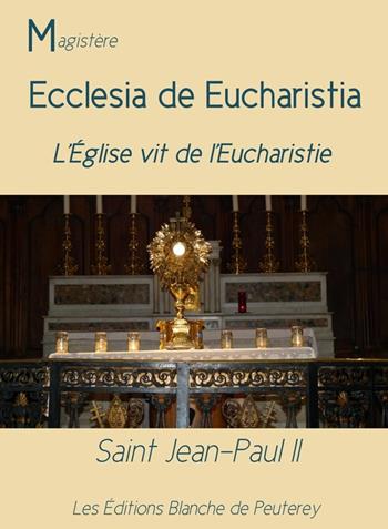 Ecclesia de Eucharistia, ou encore « l'Église vit de l'eucharistie », est la dernière encyclique de Jean Paul II ; elle date de 2003. À cette époque, le saint Pape était déjà gravement malade, mais il conservait toute sa lucidité pour rappeler au peuple chrétien l'importance de l'eucharistie dans la vie de l'Eglise, et dans la vie de chacun. Il est difficile de parler de testament, mais on ne peut s’empêcher de penser que Jean-Paul II nous délivre un message fondamental. L’encyclique est composée de six chapitres : dans le 1er intitulé « Mystère de la Foi », le pape rappelle les fondements de la foi chrétienne sur l’eucharistie. Puis il détaille dans le second chapitre comment l’eucharistie édifie l’Église. Il souligne dans le troisième que l’activité apostolique de l’Église repose sur l’eucharistie. Au chapitre 4, il explique que c’est grâce à l’eucharistie que se fait la communion ecclésiale ; dans le chapitre 5, il rappelle quelques principes pour une célébration eucharistique digne. Il consacre le dernier chapitre à Marie, la femme eucharistique.