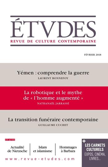 Éditorial : De nouveaux chercheurs de Dieu - N. Sarthou-Lajus International : - Quel bilan pour la justice internationale des Balkans ? - J.-A. Dérens - Yémen : comprendre la guerre - L. Bonnefoy Société : - La robotique et le mythe de « l’homme augmenté » - N. Jarrassé - La transition funéraire contemporaine - G. Cuchet Essai : - Nietzsche, un athée paradoxal - D. Astor & P. Valadier Religion & Spiritualité : - Islam et islamisme. Le défi de la question théologique - E. Pisani Arts & Littérature : - Barbara, la fleur d’amour - A. Bing Sans oublier les chroniques politique, spiritualité et écologie, les critiques expos, cinéma et livres...