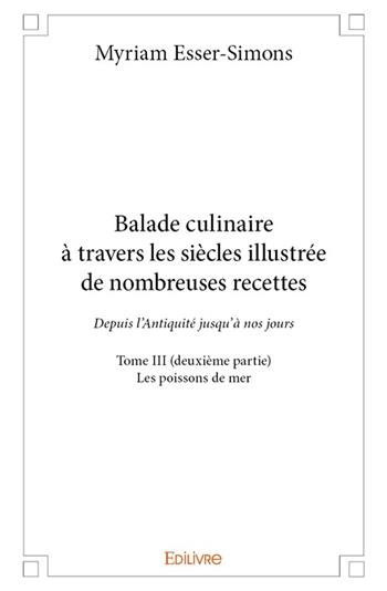 Le Tome III (deuxième partie) de notre ouvrage Balade culinaire à travers les siècles (allant de l’Antiquité jusqu’à nos jours) est consacré aux poissons de mer, allant du cabillaud jusqu’à la sole et au turbot, poissons très réputés en gastronomie. Le livre comprend des introductions historiques à chacun de ces poissons de mer, ainsi que de nombreuses recettes. Cette deuxième partie du Tome III se termine par des références bibliographiques.