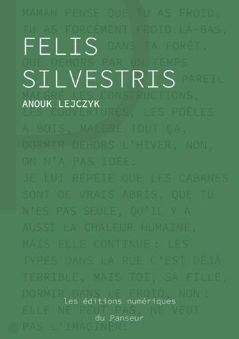 "Pépite de librairie, découverte d'une auteure, famille en déroute, il y a tant de raisons de se laisser tenter par ce petit bijou". Coup de coeur librairie Atout livre. Sans crier gare, Felis est partie rejoindre une forêt menacée de destruction. Elle porte une cagoule pour faire comme les autres et se protéger du froid. Suspendue aux branches, du haut de sa cabane, ou les pieds sur terre, elle contribue à la vie collective et commence à se sentir mieux. Mais Felis ignore que c ´est sa sœur qui la fait exister - ou bien est-ce le contraire ? Entre les quatre murs d ´un appartement glacial, chambre d ´écho de conversations familiales et de souvenirs, une jeune femme tire des fils pour se rapprocher de Felis - sa sœur, sa chimère. Progressivement, la forêt s'étend, elle envahit ses pensées et intègre le maillage confus de sa propre existence. Sans doute y a-t-il là une place pour le chat sauvage qui est en elle. Premier roman d ´Anouk Lejczyk, Felis Silvestris renverse les codes du Nature Writing et nous plonge, le temps d ´un hiver, dans une histoire intime et sensible, explorant notre imaginaire et nos inquiétudes face à des choix de vie qui nous effraient autant qu ´ils nous fascinent.