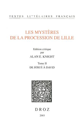 Le tome II des Mystères de la procession de Lille contient l’édition critique de seize pièces dramatiques inspirées de l’Ancien Testament. Ces mystères sont connus par un manuscrit unique conservé à la Herzog August Bibliothek à Wolfenbüttel, qui renferme en tout soixante-douze mystères joués à Lille à l’occasion de la grande procession annuelle de cette ville. Les pièces présentées dans ce tome traitent de l’histoire biblique depuis le livre de Josué jusqu’au deuxième livre de Samuel. Deux de ces mystères sont consacrés à Josué et deux autres pièces mettent en scène les guerres de Saül. On trouvera aussi l’histoire de Gédéon et de la toison ainsi que le mariage de Booz et de Ruth. Le tome se clôt sur une série de neuf pièces qui traitent de la vie et du règne de David. Les mystères suivants paraîtront dans les trois tomes à venir.