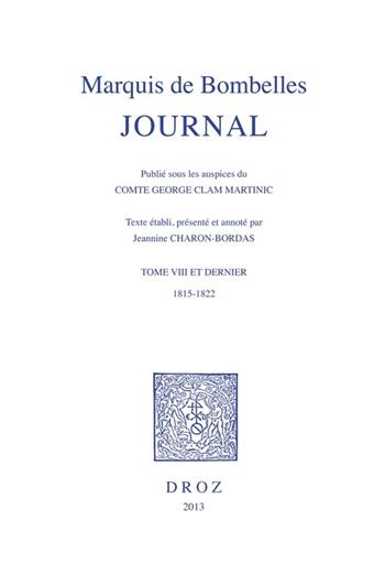 La longue vie du marquis de Bombelles, né en 1744 sous le règne de Louis XV, s’achève au début de l’année 1822. Son Journal, tenu quotidiennement de 1780 à sa mort, est la chronique de ce presque demi-siècle. Le huitième et dernier tome de ce journal, qui couvre les années 1815 à 1822, aurait dû être le temps de la sérénité : la patrie retrouvée, la monarchie restaurée, la famille rassemblée. Il a surtout été le temps du désenchantement ; le marquis n’a pas reconnu, en 1815, le pays qu’il avait quitté en 1789 ; la cour de Versailles ne s’est pas reconstituée ; le roi lui-même n’est plus que l’ombre du souverain imaginé par le marquis. Sans doute Bombelles nous livre une vision nostalgique de ces années, mais aussi un récit vivant et fidèle du temps.