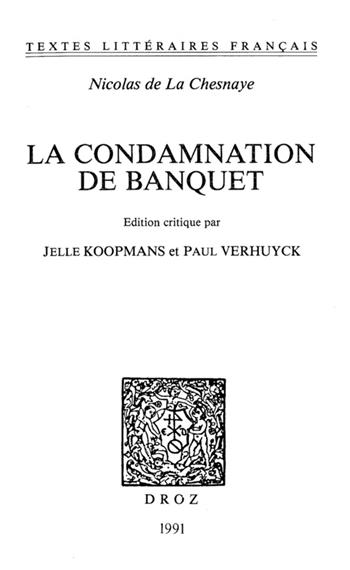 La Condamnation de Banquet est citée dans toutes les grandes histoires du théâtre médiéval français comme le chef-d'oeuvre du genre dramatique de la moralité. Mais les éditions de Fournier, 1872, et de Jacob, 1859, ne sont guère accessibles de nos jours, et nécessiteraient bien des corrections. MM. Koopmans et Verhuyck basent leur texte sur l'édition de Vérard, 1507 (reproduite en facsimilé par Helmich en 1980), en tenant compte des variantes des autres imprimés anciens, et d'un nouveau témoin textuel, le manuscrit de Wolfenbüttel, non utilisé jusqu'ici. Vocabulaire et allusions sont expliqués avec maestria.