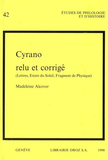 Lettres, Estats du Soleil, Fragment de Physique. Mme Alcover a découvert des états inconnus des oeuvres de Cyrano, sous forme de cartons dus à la censure, dans le cas des Lettres de 1654, et de corrections sous presse, dans les Nouvelles Oeuvres de 1662. Nouveaux textes de Cyrano, observations sur l'histoire du livre, révision de la biographie de Cyrano en découlent. Sa participation à la Fronde, ainsi que la réception de la philosophie de Descartes par les libertins, sont étudiés spécialement.