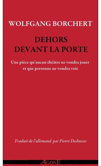 « Un homme rentre en Allemagne. Mille jours durant, il a attendu dans le froid. Et après avoir attendu mille nuits dans le froid, il peut enfin rentrer chez lui. Et la vie qui l’attend ressemble à un film hallucinant. Il doit se pincer, ne sachant pas s’il rêve. Il s’aperçoit alors qu’il y a des gens qui vivent la même chose que lui. Il se rend compte que c’est un film ordinaire. L’histoire d’un homme qui rentre en Allemagne, comme tant d’autres. Tous ces gens qui reviennent chez eux sans pourtant rentrer car ils ne savent plus où aller. Chez eux, c’est dehors, devant la porte. Leur Allemagne, elle est là dehors, dans la nuit, dans la pluie, dans la rue. Voilà leur Allemagne ! » Né à Hambourg en 1921, Wolfgang Borchert est envoyé sur le front russe en 1941. Il en revient blessé et malade et passe la guerre entre l’hôpital, le front, et la prison, pour automutilation et activités subversives. À l’automne 1946, il écrit en une semaine la pièce qui fait de lui le premier écrivain célèbre de l’après-guerre allemande et, avec Heinrich Böll, l’un des représentants majeurs de la « littérature des ruines » : Dehors devant la porte, le récit du retour de Beckmann, simple soldat dont le foyer n’existe plus. Borchert meurt le 20 novembre 1947, la veille de la première de sa pièce.