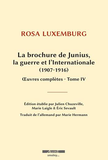 Rédigée en 1915 en prison, La Crise de la social-démocratie, plus connue sous l’appellation de « Brochure de Junius », est complétée dans ce volume par les articles et discours du groupe Die Internationale (traduits pour la première fois) ainsi que les interventions de Rosa Luxemburg dans le cadre de l’Internationale socialiste. L’ensemble constitue un réquisitoire implacable contre la guerre et l’abandon du terrain de classe par la IIe Internationale. C’est aussi une exhortation lucide adressée au prolétariat à prendre toute la mesure de cette bifurcation historique que représente août 1914. Notre présent reste prisonnier de l’alternative posée depuis lors : révolution socialiste ou enfoncement dans la barbarie. Rosa Luxemburg (1871-1919), née en Pologne russe en 1871, est l’une des principales militantes et théoriciennes du mouvement ouvrier international avant et pendant la Première Guerre mondiale. Elle enseigne l’économie politique de 1907 à 1913 à l’école du parti social-démocrate allemand de Berlin. Elle maintient lors du premier conflit mondial un internationalisme intransigeant qui lui vaut d’être emprisonnée de façon quasi-continue jusqu’à sa libération par la révolution de Novembre 1918. Avec le groupe Spartakus elle se lance dans une intense activité révolutionnaire jusqu’à son assassinat le 15 janvier 1919 par les corps-francs.