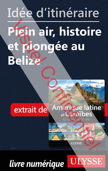 Id?e d'itin?raire - Plein air, histoire et plong?e au Belize est un court extrait, source d'inspiration pour partir ? la d?couverte des principaux attraits du pays. Id?e d'itin?raire - Plein air, histoire et plong?e au Belize est un court extrait en format num?rique tir? du beau livre Ulysse " Am?rique latine et Cara?bes ? 50 itin?raires de r?ve ". Il sugg?re bri?vement un itin?raire de 6 jours ? la d?couverte des principaux attraits du pays.