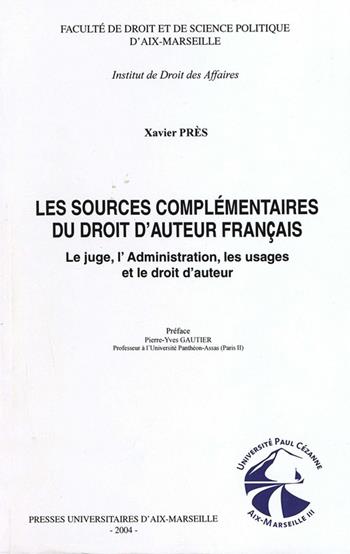 Les sources complémentaires du droit d'auteur français recouvrent l'ensemble des règles extra-légales procédant d'organes qui ne sont pas officiellement investis d'une compétence normative, c'est-à-dire du pouvoir de poser des règles générales et obligatoires. La jurisprudence avec les règles jurisprudentielles et les principes généraux du droit ; la pratique administrative constituée des circulaires et avis administratifs et des réponses ministérielles aux questions écrites des parlementaires ; et la pratique professionnelle avec les usages dont certains sont codifiés dans des instruments normatifs disparates tels que les codes des usages, les contrats types et les codes de conduite, complètent la loi, par nature imparfaite, et contribuent chacune à leur manière à l'élaboration de règles générales qui participent à et de la réglementation du droit. Leur insertion au rang des sources du droit sera appréciée à l'aune d'une perspective pluraliste des sources du droit.