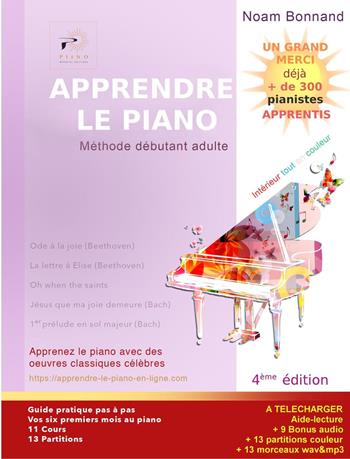 « APPRENDRE LE PIANO Méthode débutant adulte » (4ème édition) est un manuel pratique sans professeur de 129 pages en couleur, format flexible avec de nombreuses illustrations. Compatible avec la majorité des supports. Il est recommandé d'étudier le livre avec une tablette et liseuse de grande taille ! Je vous conseille également d'imprimer les partitions contenues dans le téléchargement offert, et de les utiliser en même temps que vous étudiez le livre. Très progressive, très claire et détaillée, cette méthode vous prend par la main et vous accompagne pas à pas pendant vos six premiers mois d'apprentissage au piano. Elle apporte au pianiste novice le bagage théorique et pratique nécessaire pour apprendre à jouer du piano, mais aussi à savoir lire une partition naturellement, grâce à la pratique du clavier. Les 11 cours et 13 partitions de cette première grande étape sont conçus pour un apprentissage d'environ 4 à 6 mois, selon le rythme de chacun. Chaque cours explique pas à pas, de façon très méthodique, tout ce que l'étudiant doit comprendre, assimiler et pratiquer sur chaque partition, puis se termine par un questionnaire permettant de s'auto-évaluer avant de poursuivre le cours suivant. Fruit de plus de 25 ans d'expérience pédagogique, ce guide vous donnera avec une pratique quotidienne régulière, toutes les clefs pour commencer à savoir lire, et jouer vos premières œuvres classiques célèbres depuis chez vous. Des surprises vous attendent à l'intérieur de l'ouvrage, ainsi qu'en cadeaux téléchargeables, pleins de bonus : -13 morceaux wav -13 morceaux mp3 -9 bonus audio -13 partitions en couleur -un Aide-lecture et bien plus encore... Pour ceux qui souhaitent aller encore plus loin. Sachez qu'une version encore plus complète de ce manuel est disponible au format papier,incluant l'étape 2 et 3. Plus de 265 pages, impression haute qualité en noir et blanc ou en couleur en tapant sur Amazon: APPRENDRE LE PIANO Méthode pour adulte 1ère année Cette méthode vous donne également accès à un cours de piano gratuit en ligne ! et bien plus encore... Vous souhaitant à tous et à toutes, une belle découverte du piano et un merveilleux voyage musical en compagnie des musiques classiques les plus célèbres du monde.