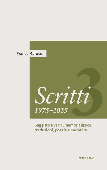 Questo volume terzo di Scritti - 1975-2025 di Franco Marucci, miscellaneo e suddiviso in cinque aree e svariati saggi, capitoli e note, documenta ed esemplifica una produzione che si è allargata, cammin facendo, dall’anglistica pura a una varia pluralità di interessi collegati e ad altri generi di scrittura, concorrendo a formare in tal modo una specie di eclettico “ritratto dell’autore attraverso le sue opere”. Il volume si apre con saggi di comparatistica, di mitologia, di traduttologia e sulle influenze e le interferenze tra le culture; una seconda area è di studi e interventi, in parte inediti, sui rapporti e gli incroci tra la letteratura e le arti, visuale e musicale, e di note, recensioni e rivisitazioni integrali delle filmografie di alcuni dei più noti registi contemporanei. La terza raccoglie dei “medaglioni” dedicati a recenti grandi maestri italiani della critica, e la quarta è una scelta di traduzioni poetiche tratte da edizioni curate dall’autore. Il volume si chiude con alcuni campioni della sua varia produzione “creativa”, come reportages, interventi mediatici su questioni dell’attualità, poesie e capitoli dei suoi tre romanzi pubblicati.