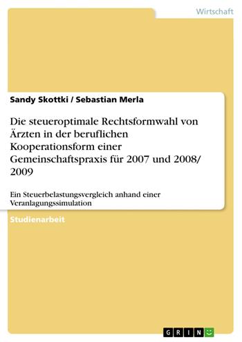 Studienarbeit aus dem Jahr 2007 im Fachbereich BWL - Rechnungswesen, Bilanzierung, Steuern, Note: 1,7, Freie Universität Berlin, Sprache: Deutsch, Abstract: Der Zusammenschluss von Freiberuflern zu einer Personen- oder Kapitalgesellschaft ist bei Rechtsanwälten oder Steuerberatern bereits weit verbreitet. Zunehmend zeichnet sich ein ähnlicher Trend auch bei den Ärzten ab. Die enorme Kapitalbelastung bei der Gründung einer neuen Praxis, die allgemeine Arbeitsbelastung oder auch das unternehmerische Risiko wird verstärkt auf mehreren Schultern verteilt. Durch die grundlegenden Veränderungen im Ärzterecht gewinnt die Entscheidung über die optimale Rechtsform einer kooperativen Berufsausübung bei Ärzten aktuell enorm an Bedeutung. Maß-geblich für eine richtige Entscheidung der Rechtsformwahl sind Kriterien wie die Haftung, Kapitalbeschaffung, Abrechnung mit den Krankenkassen und insb. die Steuerbelastung. Dabei ist zu beachten, dass durch eine Änderung der persönlichen, rechtlichen oder wirtschaftlichen Rahmenbedingungen sich die Frage der optimalen Rechtsform nicht nur bei einer Neugründung, sondern kontinuierlich über die gesamte Lebensphase einer Praxis stellt. In der vorliegenden Arbeit liegt ein besonderer Fokus auf der Betrachtung der steuerlichen Auswirkungen der in Frage kommenden Rechtsformen. Die-se sollen anhand einer selbst erstellten Veranlagungssimulation im Zusammenhang mit einer Sensitivitätsanalyse betrachtet werden. Dabei werden zunächst die Kooperationsformen von Ärzten abgegrenzt und anschließend die Grundlagen zur Besteuerung von Personengesellschaften und Kapitalgesellschaften nach den Rechtslagen 2007 und 2008/ 2009 dargestellt. Anschließend werden die Ergebnisse der Veranlagungssimulation und deren Einflußparameter erläutert. Dabei wird auf die Kirchensteuer, die Gewinnhöhe, den Gewerbesteuerhebesatz, den zivilrechtlichen Verträgen etc. eingegangen und nach aktueller Rechtslage (2007 sowie 2009) eine Ergebnisdarstellung aufgezeigt. Zudem werden noch die aperiodischen Betrachtungen hinzugezogen.
