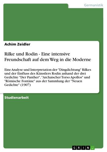 Studienarbeit aus dem Jahr 2004 im Fachbereich Germanistik - Neuere Deutsche Literatur, Note: 1,00, West Virginia University, Sprache: Deutsch, Abstract: Der am 4. Dezember 1875 in Prag geborenen Dichter René Karl Wilhelm Johann Josef Maria Rilke, uns besser unter der Kürzung Rainer Maria Rilke bekannt, ist wohl einer jener deutschsprachigen Schriftsteller, die den Anspruch erheben können als „besonders lesenswert“ eingestuft zu werden, um einen Ausspruch Marcel Reich-Ranickis zu verkürzen, für den „Generationen deutscher Leser galt und gilt er als die Verkörperung des Dichterischen, sein klangvoll-rhythmischer Name wurde zum Inbegriff des Poetischen“ (Reich-Ranicki 681). Rilke ist ein Phänomen. Ein Mann, der viele dichterische und künstlerische Phasen, literarische Gattungseinstufungen und bestehende Auffassungen seiner Lebenszeit sprengte. Einer derjenigen, die sich immer verändern und doch nie ändern, denn Rilke war und ist ein Meister der Sprache und Form, er ist die Melodie der Literatur, die er in unzähligen Facetten und Nuancen seinen Lesern zuteil kommen lässt. Wie erwähnt wird das Hauptaugenmerk dieser Hausarbeit auf Rilkes „Römische Fontäne“ (Villa Borghese) gelegt, welches Rilke im Jahr 1906 verfasste und in seinem 1907 erschienenen Band die „Neuen Gedichte“ veröffentlichte. Dieses Gedicht zeigt den sprachlich-stilistischen und rhythmisch-melodischen Wert einer Kunstauffassung verbunden mit einer dichterischen Genauigkeit und spiegelt einen wesentlichen Lebensabschnitt Rilkes wider, den er durch die Zusammenkunft mit einem, für ihn interessantesten und begabtesten impressionistischen Künstlern der Welt, Auguste Rodin, erfahren hat. In dieser Eigenschaft lässt der Dichter die „Wirklichkeit“ der Kunst und Natur erklingen. Wie und mit welchen Mitteln Rilke diese Art der Dichtung erschaffen hat und wie weitreichend der Rodin`sche Einfluss auf dieses Werk einging, werde ich im Folgenden genau untersuchen und eine formale und inhaltliche Interpretation der „Römischen Fontäne“ geben. 1. Einleitung Rainer Maria Rilke und Auguste Rodin sind zwei Künstler, der eine in der literarischen, der andere in der bildenden Kunst, die nicht ohne Schwierigkeiten einer einzelnen Epoche oder eines bestimmten Stils zugeordnet werden können, haben beide doch so vielfältige und weitlaufende Einflüsse in ihrem Leben erfahren, umgesetzt und erzeugt. [...]
