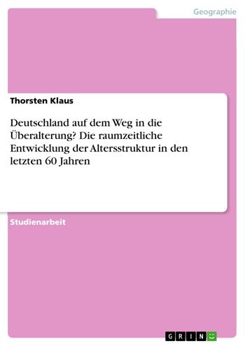 Studienarbeit aus dem Jahr 2007 im Fachbereich Geowissenschaften / Geographie - Bevölkerungsgeographie, Stadt- u. Raumplanung, Note: 2,0, Universität zu Köln (Geographisches Institut), Veranstaltung: Demographische Strukturen und Prozesse, Sprache: Deutsch, Abstract: Der aktuelle demographische Wandel in Deutschland ist durch Rückgang, Alterung und Wanderungsbewegungen der Bevölkerung gekennzeichnet. Die Überalterung resultiert aus einer Abnahme der mittleren Geburtenzahl je Frau auf z. Z. 1,4. Dieser Wert liegt unter dem Reproduktionsniveau der Bevölkerung. Die Gründe für den Rückgang der Geburtenzahl sind vielfältig: Sinkende Heiratsneigung, vermehrte Scheidungen, Eheschließungen in einer späteren Lebensphase, Anstieg des mittleren Alters von Frauen bei der Geburt ihres ersten Kindes, Kinderlosigkeit, sowie die Zunahme nicht-ehelicher Lebensgemeinschaften (KILPER, H. & MÜLLER, B. 2005: 36). Die demographischen Prozesse sind räumlich unterschiedlich stark ausgeprägt. Vor allem in den ostdeutschen Bundesländern werden die Probleme, die mit Überalterung und schrumpfenden Einwohnerzahlen verbunden sind, bereits heute exemplarisch sichtbar. Daher bietet es sich an, die Entwicklung in Ost- und Westdeutschland getrennt voneinander zu betrachten. Da auch zwischen ländlichen und verstädterten Räumen Unterschiede der Altersstrukturentwicklung festzustellen sind, soll auch dieser Aspekt gesondert betrachtet werden. Die Folgen, die die zunehmende Überalterung für den Arbeits- und Wohnungsmarkt, die sozialen Sicherungssysteme und die infrastrukturelle Planung hat, soll ebenso diskutiert werden.