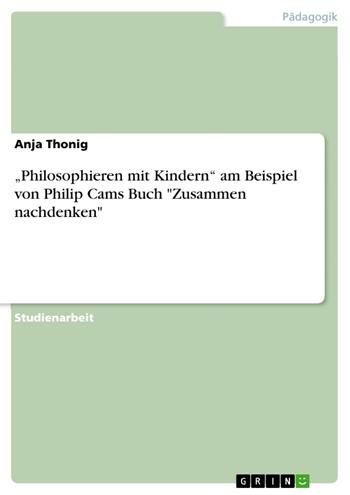 Studienarbeit aus dem Jahr 2007 im Fachbereich Pädagogik - Sonstiges, Note: 2,7, Universität Leipzig, Sprache: Deutsch, Abstract: 1. Einleitung In meiner Hausarbeit zum Thema „Philosophieren mit Kindern“ beziehe ich meine Ausführungen hauptsächlich auf Philip Cams Buch „Zusammen nachdenken“. Nach den im Buch gesetzten Schwerpunkten beziehe ich mich darauf, wie der Lehrer die Kinder in einer Unterrichtsdiskussion zum Nachdenken anregen und beispielhafte Übungen und Geschichten dafür einsetzen kann. Die folgenden Überlegungen werden mit Cams Zielstellung für sein Buch und der Klärung der Frage was Philosophie, vor allem Kinderphilosophie, primär bedeutet, eingeleitet. Außerdem werde ich mich mit der Rolle der Philosophie im Unterricht auseinandersetzen. Der zweite Teil meiner Arbeit widmet sich der Frage nach den Aufgaben des Lehrers für eine philosophische Diskussion in der Klasse und welche Mittel ihm zur Verfügung stehen um diese zu lenken und die Kinder zum „zusammen nachdenken“ anzuregen. 2. Philip Cams Zielstellung: Philip Cams vordergründiges Ziel liegt in der Integration der Philosophie als (Denk-) Ansatz in andere Disziplinen. Er ist der Auffassung, dass man durch philosophische Fragen und Themen in das Zentrum der anderen Disziplinen gelangt. Das Denken betrifft seiner Ansicht nach alle Bereiche des Lehrplans. Daraus folgend, sieht er in der Philosophie im Unterricht die einzige Möglichkeit dem Denken eine zentrale Rolle zuzusprechen und so den Kindern zu helfen effektive Denker zu werden. Sein Buch „Zusammen nachdenken“ soll vor allem als Hilfestellung für die Lehrer betrachtet werden, um zum Einen das Verständnis für die Fragen und Ideen zu fördern und zu vertiefen und zum Anderen soll die Denkfähigkeit, vordergründig das reflexive Denken, der Kinder erhöht werden, da dieses Voraussetzung für die Entwicklung eines intelligenten und vernünftigen Kindes ist. „Dieses Buch stellt einen Weg vor Kindern zu helfen dieses Denken zu entwickeln.“ [...] 'Dieses Buch stellt einen Weg vor Kindern zu helfen dieses Denken zu entwickeln.' [...]