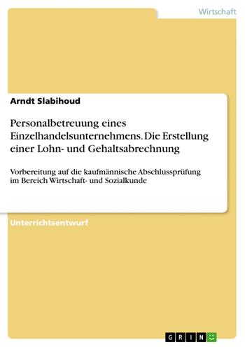 Unterrichtsentwurf aus dem Jahr 2007 im Fachbereich Didaktik - BWL, Wirtschaftspädagogik, Note: 1,7, , Sprache: Deutsch, Abstract: Bei der heutigen Unterrichtsstunde handelt es sich um eine Anwendungsstunde, in der die Schüler in Partnerarbeit unter Zuhilfenahme von Arbeitsblättern den Weg vom Bruttolohn zum Nettolohn in Einzelschritten erläutern und eine Gehaltsabrechnung erstellen. Sie können begründen, warum sich der Auszahlungsbetrag bei gleichem Bruttogehalt bei zwei Mitarbeitern unterscheiden kann. Zudem errechnen sie die Lohnkosten, die dem Arbeitgeber entstehen. Dieses Thema ist bei den Schülern beliebt, da ein realistischer Einblick in (zukünftige) Einkommenssituationen (brutto, netto - was kommt heraus?) sehr motivierend auf alle am Unterricht Beteiligten wirkt. Für die Schülerinnen und Schüler ist dieses Thema von zweifacher Bedeutung. Als Arbeitnehmer(innen), die in Abhängigkeit von der Höhe der Ausbildungsvergütung zumeist weder Lohnsteuer noch Solidaritätszuschlag und Kirchensteuer abgezogen bekommen, sind sie jedoch Beitragszahler in den Sozialversicherungen. In der heutigen Stunde wird aus Gründen der Motivation, ein mögliches zukünftiges Einstiegsgehalt als Berechnungsgrundlage herangezogen. Darüber hinaus sind Ermittlung des Nettogehaltes sowie die jeweils aktuellen rechtlichen Bedingungen für eine Lohn- und Gehaltsabrechnung stets möglicher Bestandteil ihrer kaufmännischen Abschlussprüfung.
