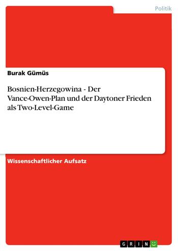 Wissenschaftlicher Aufsatz aus dem Jahr 1998 im Fachbereich Politik - Region: Südosteuropa, , Sprache: Deutsch, Abstract: Der Friede von Dayton und der davor gescheiterte Vance-Owen-Friedensplan sollen hier als Zwei-Ebenen-Spiel modelliert werden. Dabei werden der jeweilige Handlungsspielraum der als Bündnispartner agierenden bosnischen und bundesrepublikanisch-jugoslawischen Serben über den Vance-Owen-Plan und über Dayton bei den Verhandlungen mit Bosnien-Herzegowina und mit der internationalen Gemeinschaft aufzuzeigen versucht und miteinander verglichen. Informationen zum Text: Der Text ist im Jahr 1998 entstanden und existiert seit 2008 auch in gedruckter Form.