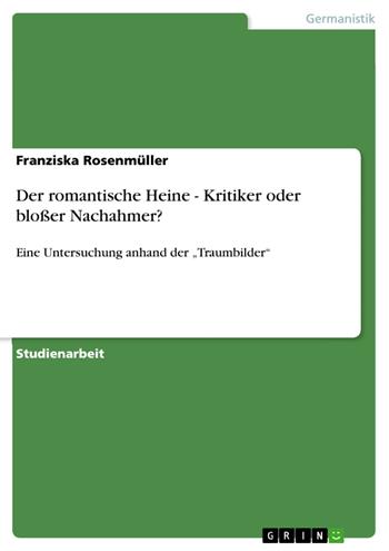Studienarbeit aus dem Jahr 2005 im Fachbereich Germanistik - Neuere Deutsche Literatur, Note: 1,0, Friedrich-Schiller-Universität Jena, Sprache: Deutsch, Abstract: Heines „Traumbilder“, der erste Zyklus von zehn Gedichten im „Buch der Lieder“, scheinen kein Thema „großer Worte“ mehr zu sein, scheinen zu wenig kontroversen Stoff zu bieten, der der einen oder aber einer ganz anderen Sichtweise genügen könnte. Heißt es doch beispielsweise recht abgeklärt, sie seien „im Wesentlichen nicht mehr als ein effektvolles Arrangement vorgefundener Motive aus Volksliedern, Legenden und Balladen“. An anderer Stelle wird Heines frühe Dichtung auf seine Biographie reduziert und damit auf die „erste ernste Liebesgeschichte“ mit der Cousine Amalie. Und wie kommt es dazu, dass in zahlreichen Publikationen zum „Buch der Lieder“ die „Traumbilder“ lediglich mit standardisierten Anmerkungen zusammengefasst oder nur flüchtig bedacht werden? Liegt es daran, dass die „Traumbilder“ ob ihrer „Offensichtlichkeit“ angesichts des Titels und der Position im „Buch der Lieder“ auf den ersten Blick keine Mannigfaltigkeiten herzugeben scheinen? Ist über sie bereits alles gesagt und geschrieben worden? Einer der vielen beachtenswerten Fragen zu Heines „Traumbildern“ nachgehend, widmet sich diese Arbeit vor allem dem Vorkommen von Elementen der romantischen Dichtung in den „Traumbildern“. Das Hauptaugenmerk soll hierbei auf dem Motiv des Traumes liegen und darauf, wie Heine es versteht, sich in hohem Maße romantischer Stilmittel zu bedienen, wodurch „nur selten de[r] Eindruck des Epigonalen“ entsteht, vielmehr jedoch das Bild eines in seiner frühen Dichtung kritisch reflektierenden jungen Künstlers.