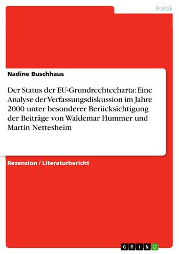 Rezension / Literaturbericht aus dem Jahr 2006 im Fachbereich Politik - Region: Westeuropa, Note: 1,0, Eberhard-Karls-Universität Tübingen, Sprache: Deutsch, Abstract: Wie kann die Grundrechtecharta der europäischen Union bewertet werden? Welche Errungenschaften sind hervorzuheben und wie sind die Schwächen zu bewerten? Ist es von entscheidender Bedeutung, dass dem Grundrechtekatalog kein verbindlicher Charakter zuerkannt wurde? Sollte die Charta zu verbindlichem Recht gemacht werden? An welcher Stelle sollte die Charta in die bestehenden Verträge eingefügt werden? Oder sollte die Charta Sockel einer europäischen Verfassung werden? Im Folgenden geht es darum, diese Fragen zu klären, wobei ein rechtswissenschaftlicher Zugang zum Problem gewählt wird. Zunächst wird ein Beitrag von Martin Nettesheim näher analysiert, der diese Fragen, die vor allem im Lichte der in Nizza verabschiedeten Erklärung über die Zukunft der Union an Bedeutung gewonnen haben, näher beleuchtet. In dem Aufsatz von Martin Nettesheim kommt eine funktionale Einschätzung der Grundrechte zum Ausdruck, wobei die Hoffnungen der Befürworter der Grundrechtecharta der Europäischen Union ebenso angesprochen werden wie die Befürchtungen, die von Skeptikern und Gegnern eines Grundrechtekatalogs in den Vordergrund gestellt werden. Anschließend wird ein Beitrag von Waldemar Hummer analysiert. Im Zentrum der Studie Hummers steht vor allem die Frage nach der Verbindlichkeit der Grundrechtecharta. Ist sie nur eine politische Erklärung oder kann sie den Kern einer europäischen Verfassung bilden? Abschließend wird die Frage gestellt, inwieweit die oben gestellten Fragen in die Verfassungsdebatte 2005/2006 aufgenommen werden. Kann man aus der Diskussion um die Grundrechtecharta lernen und die gewonnenen Erkenntnisse in die aktuelle Verfassungsdebatte einfließen lassen? Lassen sich Muster innerhalb der Debatte erkennen, die sich stetig wiederholen? Diese abschließende Diskussion, die wohl in Zukunft nicht oft genug geführt werden kann, versteht sich als Überleitung in die aktuelle Debatte über den politischen Umgang mit den gescheiterten Verfassungsreferenden und dem unsicheren „Projekt EU“.
